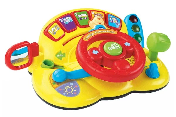 Mit der lustigen Fahrschule von vtech lernen Kinder spielerisch Farben, Fahrzeuge, Formen und Tiere kennen. Im fantasievollen Rollenspiel mit dem Lenkrad tauchen sie in die bunte Welt des Fahrens ein. Es gibt 3 verschiedene Spielmodi, die sich auswählen lassen: Tiere, Musik und Fahren. Mit dem Zündschlüssel geht es los auf die spannende Autoreise. Im Außenspiegel lassen sich Verfolger erspähen und mit dem Blinkerhebel setzt das Kleinkind zum Überholen an. Die Fahrschule lehrt auch das erste Verständnis für rechts und links. Für Kinder ab 12 Monate bis 3 Jahre geeignet. Inklusive 2 AA Demobatterien.